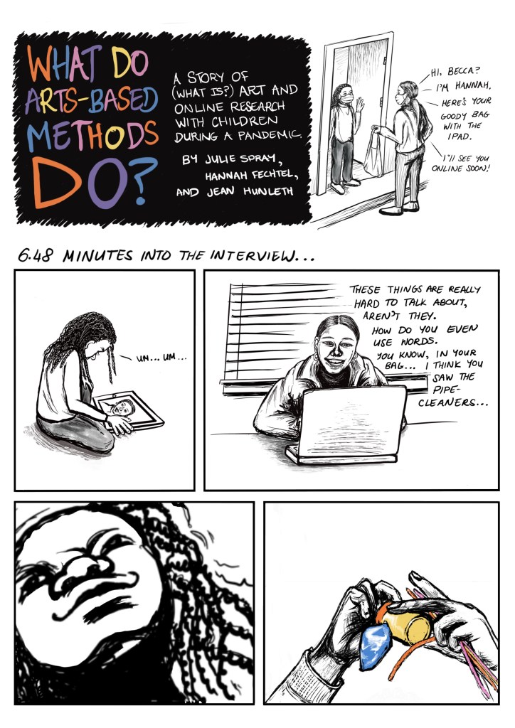 Spray, Julie, Hannah Fechtel, and Jean Hunleth. 2022. “What Do Arts-Based Methods Do? A Story of (What Is) Art and Online Research with Children during a Pandemic.” Sociological Research Online 27 (3): 574–86. https://doi.org/10.1177/13607804211055492.