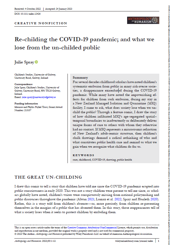 Spray, Julie. 2023. ‘Re-Childing the Covid-19 Pandemic, and What We Lose from the Un-Childed Public’. Anthropology and Humanism 00: 1–13. https://doi.org/10.1111/anhu.12426